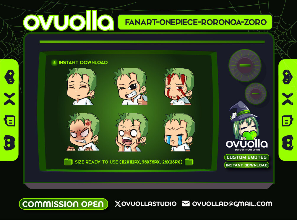 #OvuollaStudio #FanartEmotes #TwitchEmotes #DiscordEmotes #YouTubeEmotes #OnePieceFanart #RoronoaZoro #AnimeEmotes #StreamerAssets #CustomEmotes